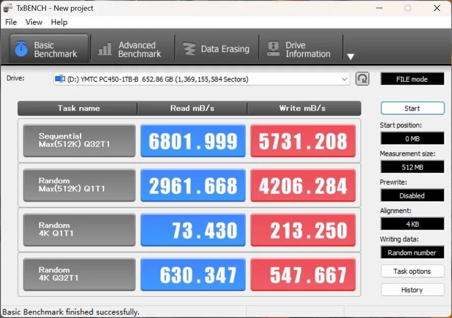 在TxBENCH中,顺序读取为6801MB/s,写入为5731 MB/s,4K单线程读写成绩分别为73MB/s和213MB/s。