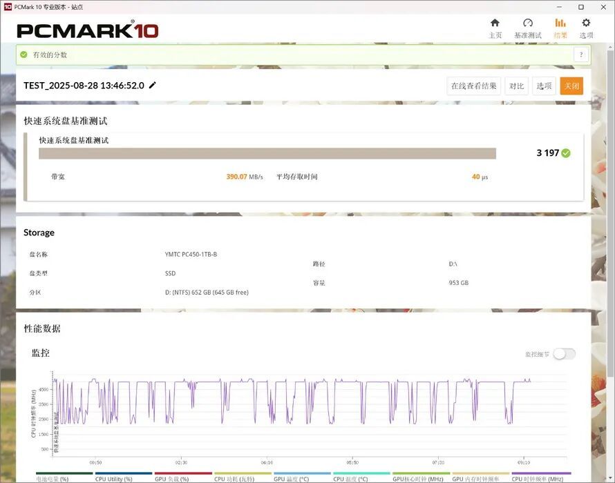 在快速系统盘基准测试中,PC450 1TB的得分为3197,带宽为390.07MB/s,平均存取时间为40μs。