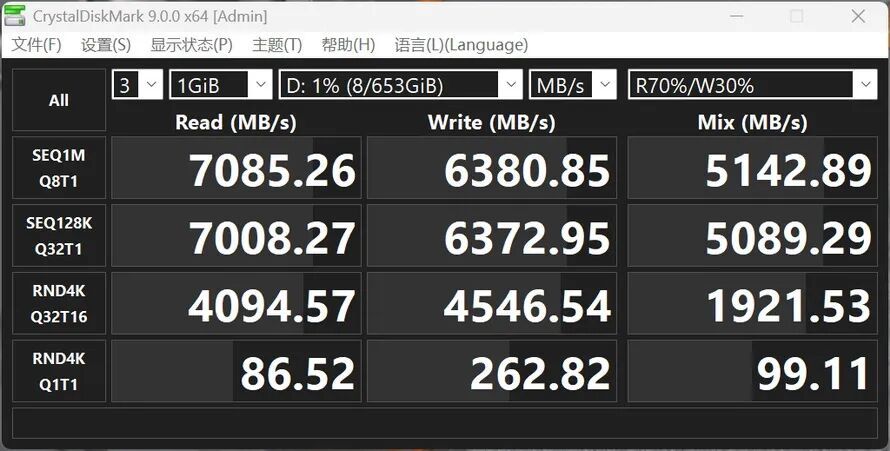 在CrystalDiskMark测试中,顺序读取速度为7085MB/s,写入6380 MB/s,4K单线程读写成绩分别为86MB/s和262MB/s。
