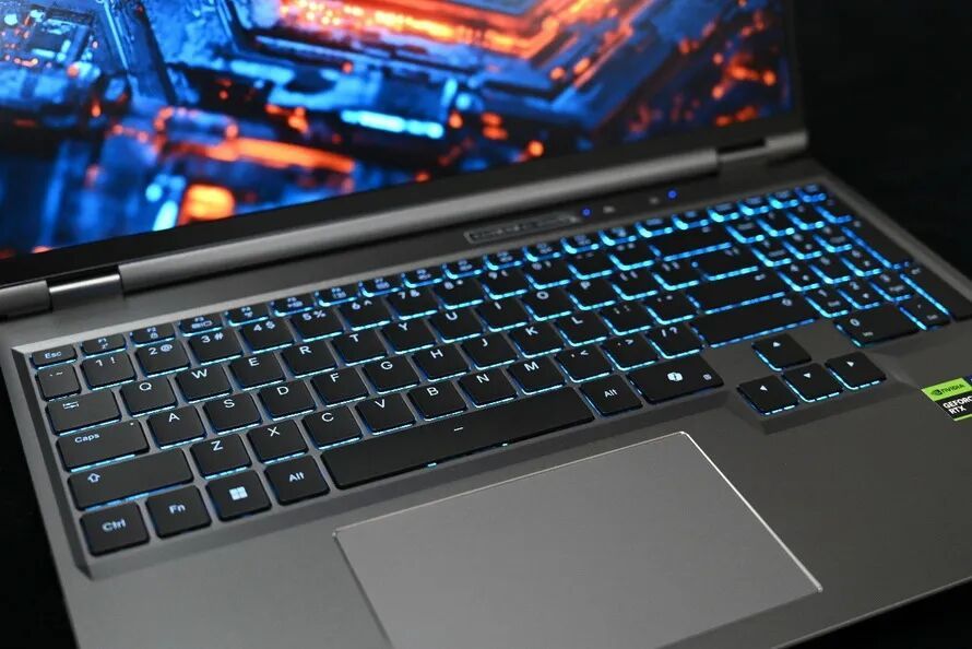 键盘支持1600万色RGB背光,并且设计了独立方向键区域,手感扎实,长时间打字或游戏都很舒适。触控板周围的亮面倒角增加了视觉精致度,与枪灰色机身的稳重相呼应,加入了一丝灵动,不会使得整体的设计太过沉闷。