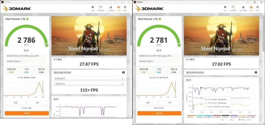 显卡单烤则是基于3DMark中的Steel Nomad测试进行,通过测试所绘制的曲线图可知,无论是在哪种模式下,耀世16 Ultra上的这张RTX 5060 Laptop都是在满血的115W性能释放下运行,因此可以预见到,在静音狂暴模式下,实际游戏性能应该并无明显差距。由于功耗并无区别,因此并未制作温度图表,可以参考之后的双烤测试。