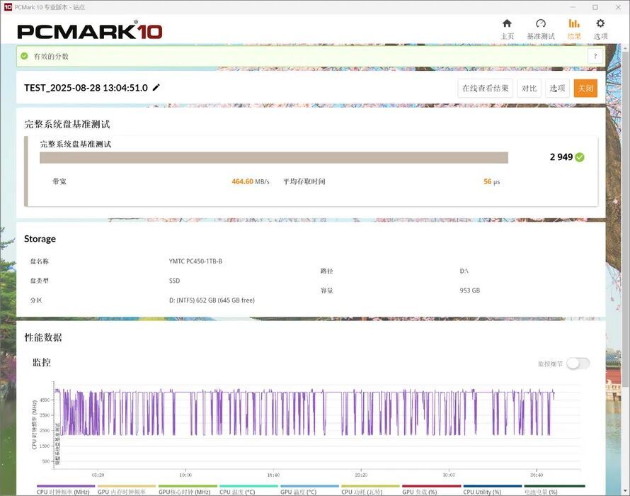 在完整系统盘基准测试中,PC450 1TB的得分为2949,带宽为464.60MB/s,平均存取时间为56μs。
