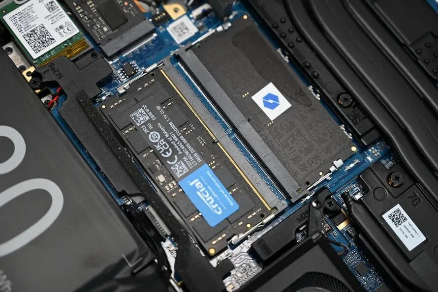 两条M.2插槽都配备了散热片。揭开内存部分的屏蔽罩,可以看到,出厂预装了两条美光的SODIMM内存条,频率为5600MT/s,两条组成双通道。