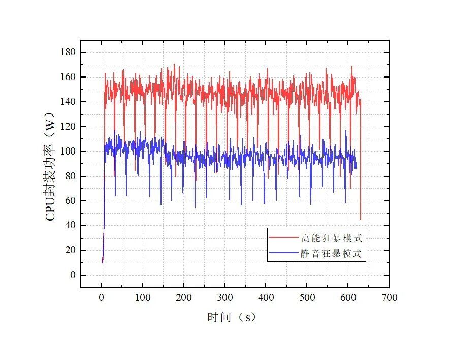 CPU单烤测试在CineBench R23的10分钟循环测试中进行,通过曲线图可以发现,在“满血”性能的高能狂暴模式中,CPU性能释放基本维持在150W左右,峰值可达170W,即便是最低亦有130W。