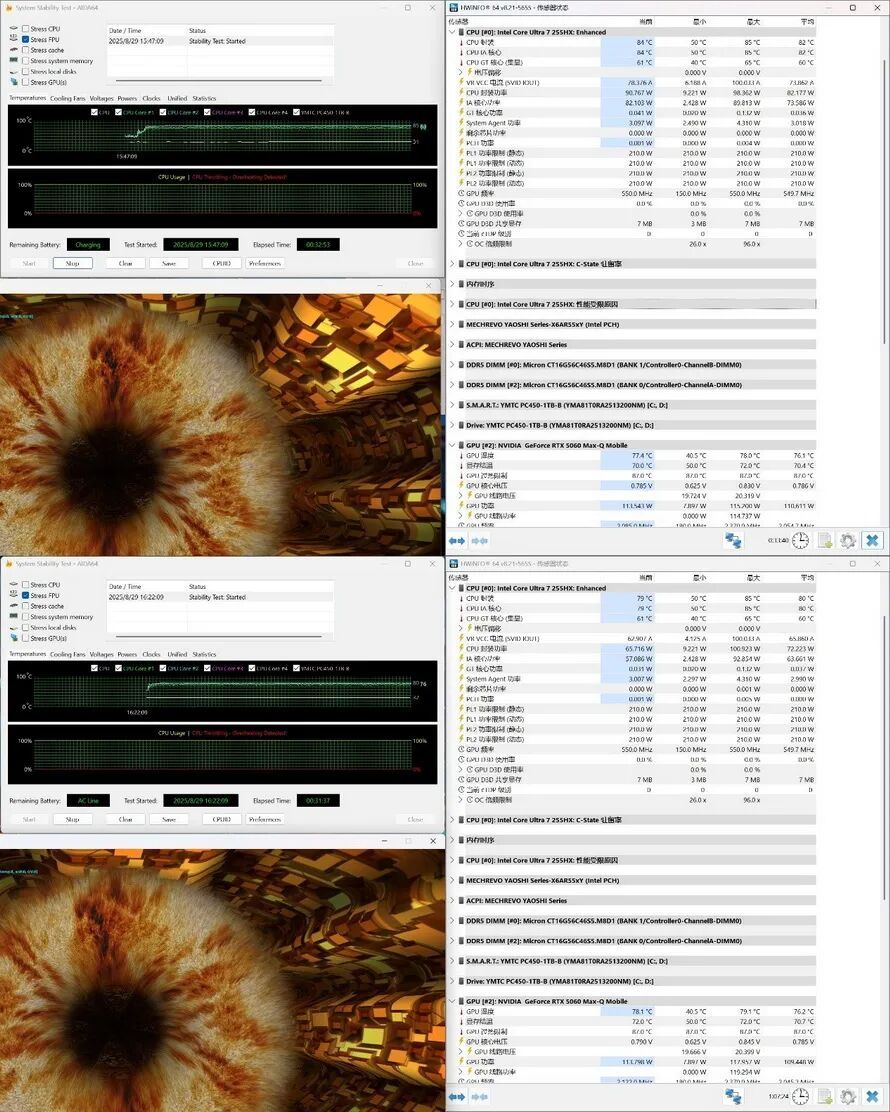 所谓静音狂暴模式,简而言之,就是通过将CPU、GPU的功耗控制在一个甜点区间内,既减少发热降低噪音,又将性能衰减控制在一个可接受的范围内。因此本次烤机测试也分别测试耀世16 Ultra在两种模式下的性能释放表现。