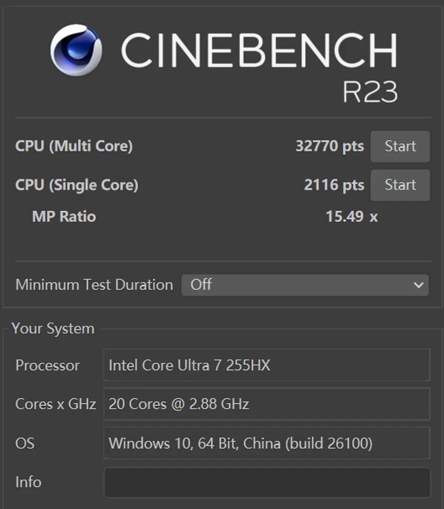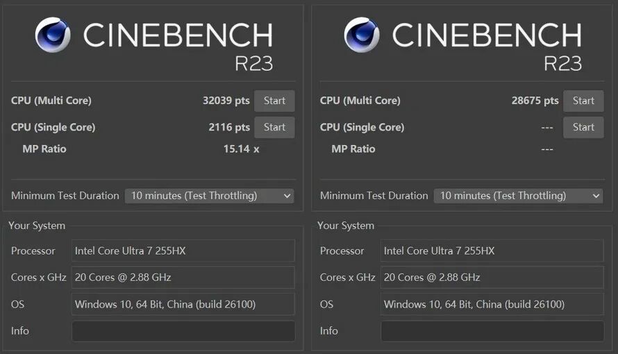 在CineBench R23的单轮测试中,耀世16 Ultra上的这颗255HX单核跑分2116,多核跑分为32770。略强于其他同处理器游戏本的得分,堪称满血性能。