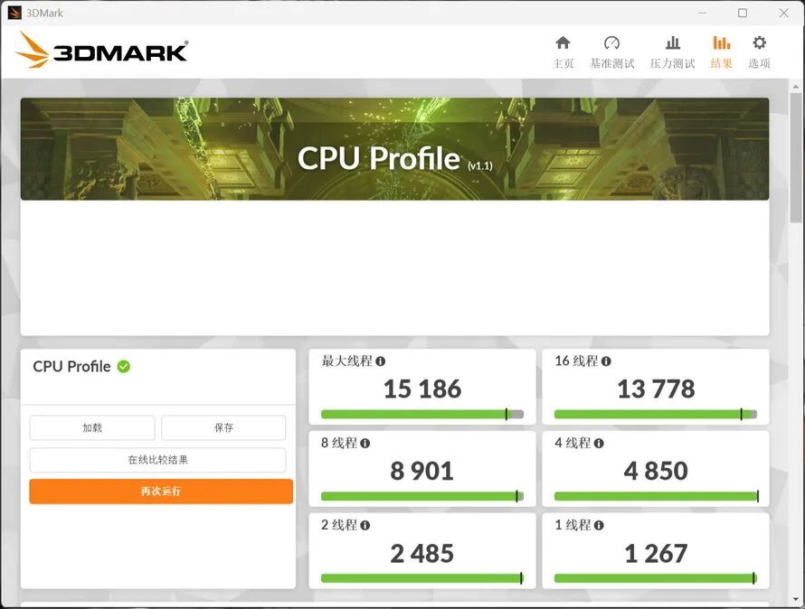 在3DMark CPU Profile中,单核得分1267,多核得分15186。