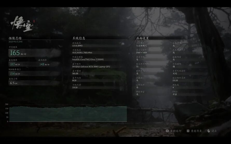 在《黑神话:悟空》中,预设高画质,开启DLSS 4,超采样75%,4倍帧生成,运行游戏自带的基准测试工具,平均帧率为165,无压力流畅运行。