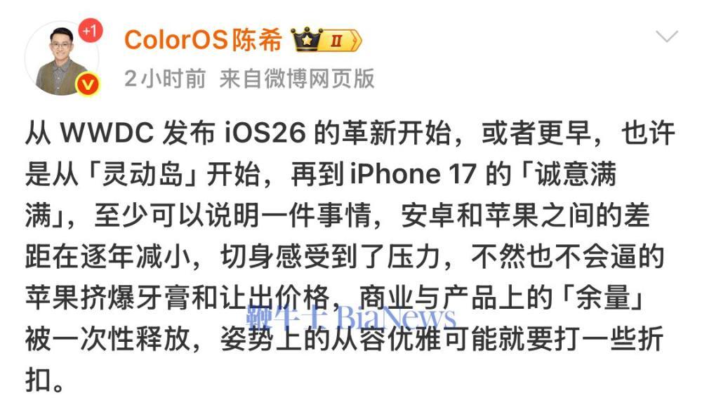 9月11日,OPPO ColorOS设计总监陈希在微博评价iPhone 17「诚意满满」 。他认为,安卓和苹果之间的差距在逐年减小,被逼的挤爆牙膏让出价格。