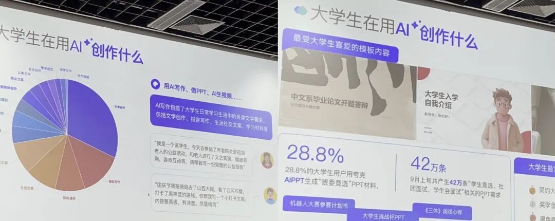 在AI创作方面,写作、做PPT是大学生最常用的方式,9月份是大学生使用PPT制作功能的高峰期,9月上旬就产生了42万份与学生竞选、社团面试相关的PPT需求。PPT风格选择最多的是是大气简约风、红色主题和黑色商务风。(可以感受到大学生对于校园生活的热情了)