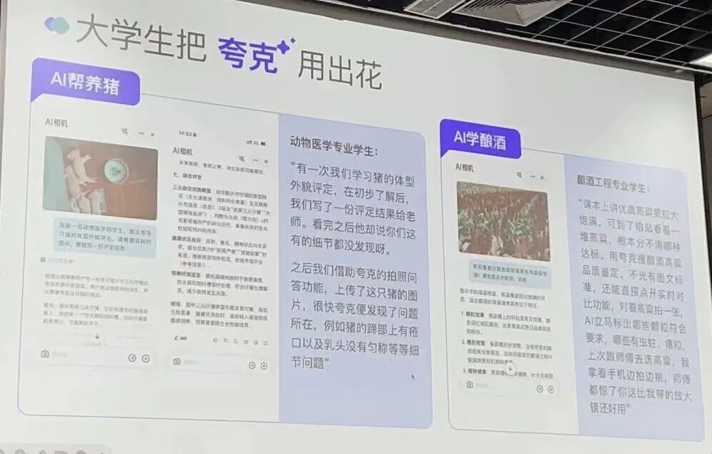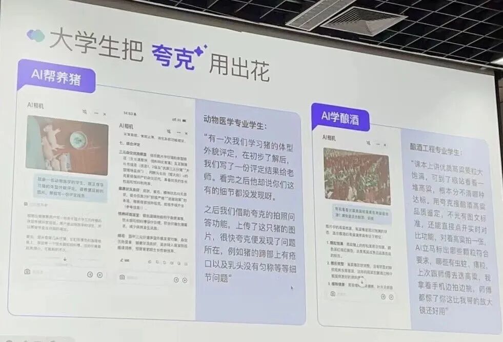 有动物医学专业的学生,在学习了猪的体型外貌培训之后写了一份评估结果,老师说细节不太够,于是他就上传图片并问夸克怎么养猪更科学,夸克AI相机识别并发现了非常多的细节问题。还有酿酒专业的学生,用夸克拍照识别不同的葡萄品种和品质。