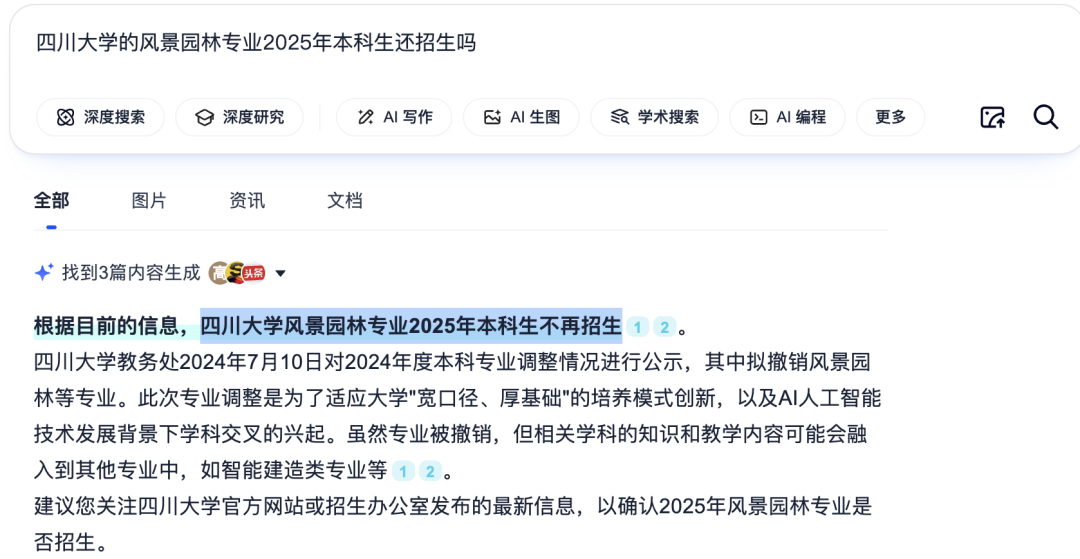 现在再次咨询夸克高考这个问题,它的回答是“四川大学风景园林专业2025年本科生不再招生”,并给出了2024年本科专业调整情况对于裁撤此专业的说明。