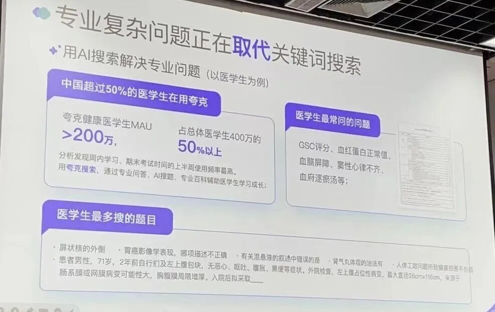 比如在AI搜索方面,夸克健康医学生MAU超过200万,有超过50%的医学生在用夸克搜索专业复杂的问题,常搜问题有“GSC评分,血红蛋白正常值,窦性心侓不齐”。