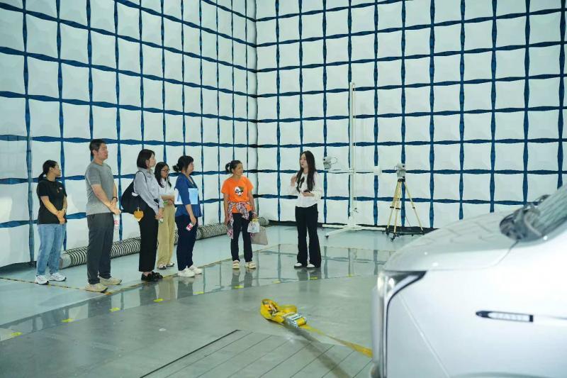 在参观环节,参观人员分别走进多个实验室进行参观了解。在整车NVH试验室,这里可以模拟不同行驶工况,测量车内外噪声、低速提示音、近场噪声、通过噪声等项目;全景环视系统试验室,则是目前京津冀地区最大的全景环视系统试验室,具备整车级别的测试能力,适用于乘用车、客车、牵引车等测试;在车载影像系统试验室,这里可以测试车载影像设备,比如汽车上的摄像头、电子后视镜、行车记录仪等,通过高精度的设备和专业的软件,来评估这些设备的图像质量、系统延迟等关键性能指标。