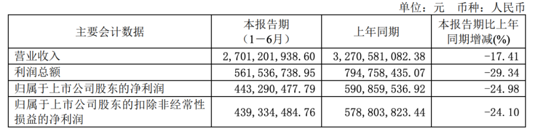 1—6月,其营收27.01亿元,净利润4.43亿元,同比均有下滑;若单看二季度,净利为9717万元,则大增近140%。