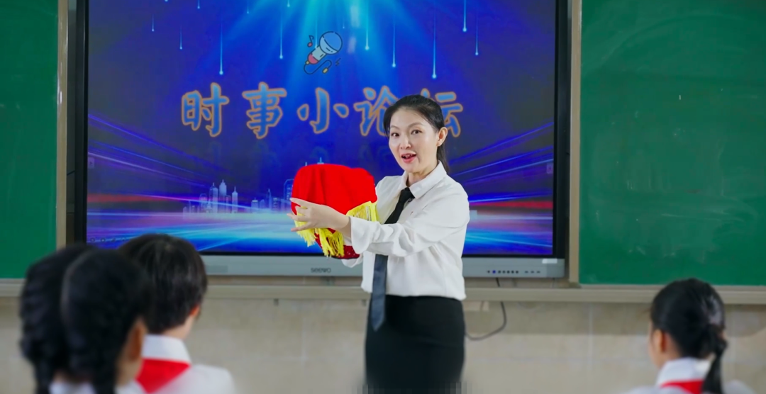 “思政课不仅应该在课堂上讲,也应该在社会生活中来讲。”胡嵘苹创新推出“师生同台时政述评模式”,变学生被动听讲为主动讲解,变成人视角为儿童立场,变单向灌输为教学相长。从“三星堆考古”聊到“乡村振兴”,从“冬奥会科技”谈到“人类命运共同体”,从“童眼看脱贫”到“点亮中国梦”,鲜活的课堂让学生沉浸式感受新时代的伟大变革,坚定听党话、跟党走的信念。