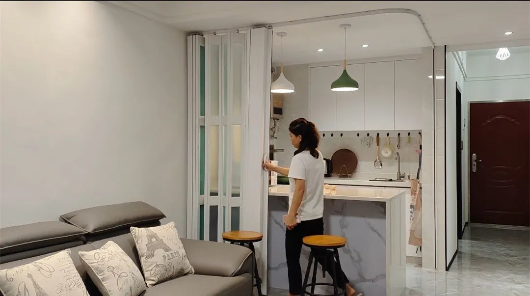 对于一些介于开放与封闭之间的空间设计(比如厨房或书房),可以选用隐形折叠门设计,平时把折叠门收起来让空间保持通透,需要用到时就拉开折叠门,实现门的阻挡效果。