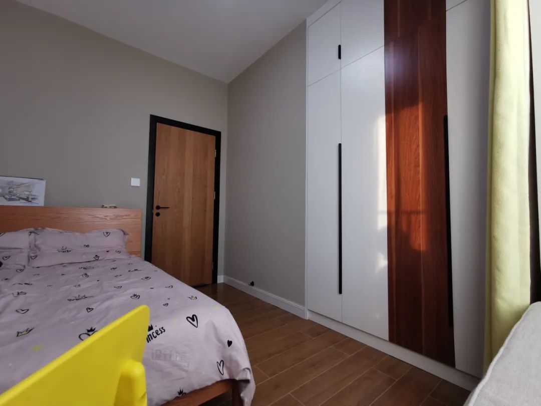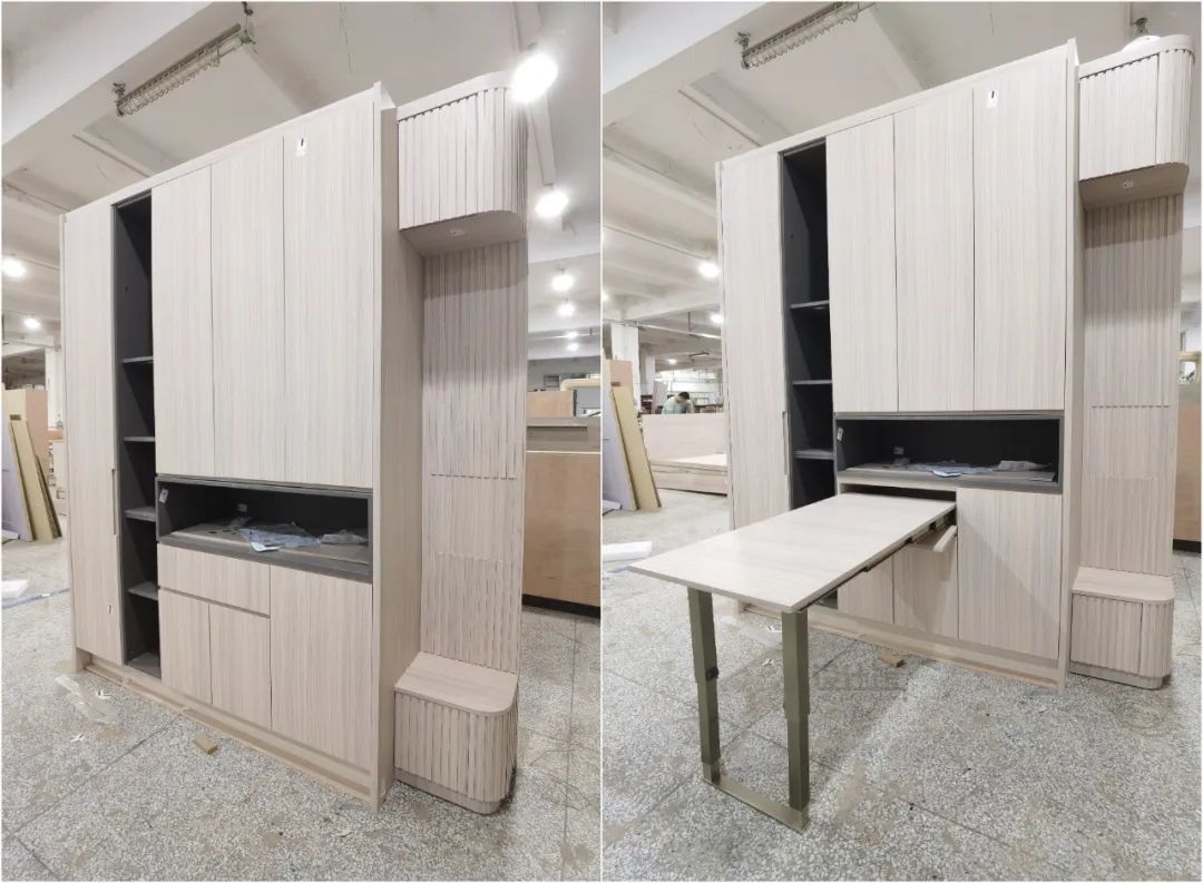 在书房里面装一个隐形折叠门,平时床体就藏在柜体上,书桌摆上作为书房;当家里有客人需要过夜时,就把折叠门展开,充当客房功能。