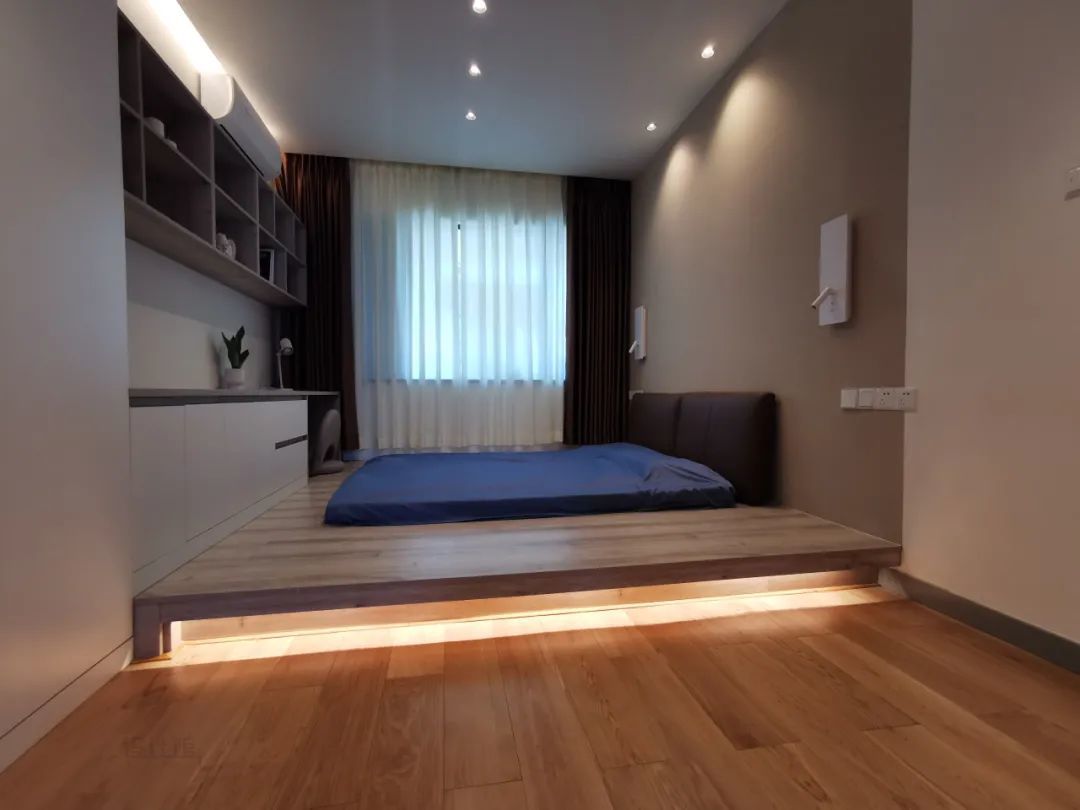 把灯带藏在柜体层板、天花灯槽、地台床等地方,做成见光不见灯的设计效果,使得照明效果更加温馨和谐而明亮大方。