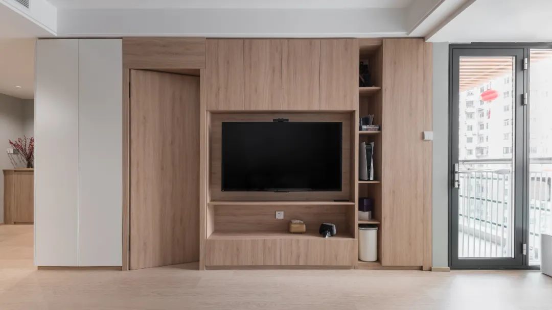 把柜子做成入墙式的设计,让柜子与墙面在同一个平面上,弱化了柜子的体积感,使得空间感更加简洁大方;若想追求隐形效果极致,可以让墙面与柜子颜色一致,并且柜子做成无拉手的设计,那么效果会更加极简高级。