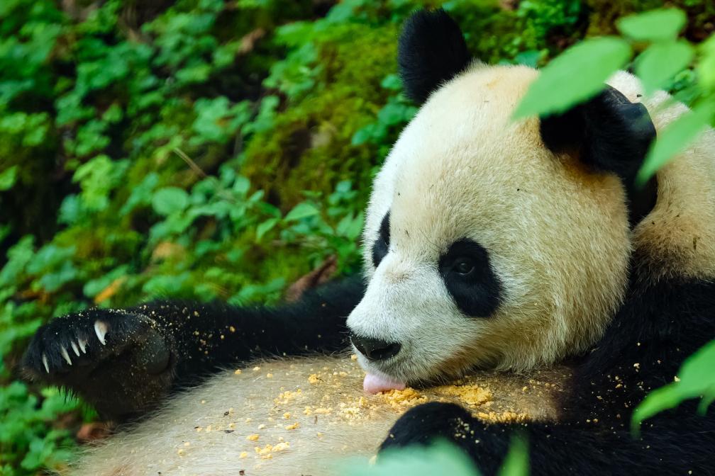 在位于大熊猫国家公园卧龙片区内天台山的大熊猫第二阶段野化培训场内,母熊猫“贤贤”在吃工作人员投喂的窝窝头(2024年6月24日摄)。 新华社记者 沈伯韩 摄