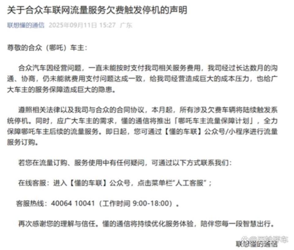 车联网流量是智能汽车的生命线,但哪吒汽车却让车主们陷入了断网危机。根据联想懂的通信发布的声明,由于合众汽车(哪吒汽车母公司)长期拖欠服务费用,经过数月协商仍未解决,自2025年9月起,所有欠费车辆将陆续触发系统停机。这意味着,哪吒汽车此前对车主的流量承诺彻底失效——以哪吒L车主为例,购车时承诺“三年内每月赠送5G流量”,如今仅过去一年多,车主就需自费购买流量,而联想懂的推出的四款流量套餐(基础功能包5.9元、月享丝滑包29.9元、全年无忧包299元、三年尊享包699元),成为车主继续用车的“唯一选择”。对于已投入十余万元购车的用户而言,这笔额外支出无疑加重了负担,更让“免费流量”的承诺沦为空谈。