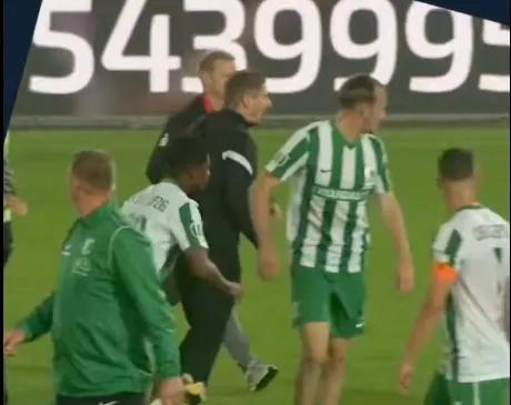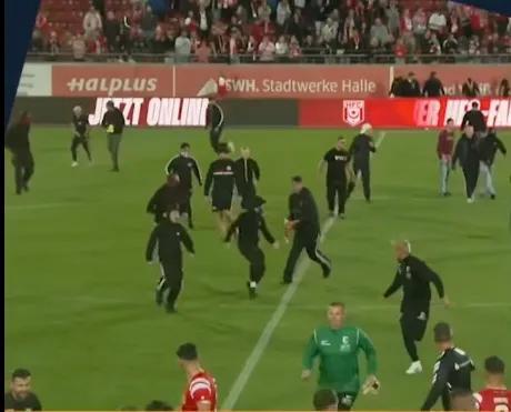 哨声刚响,主场球迷彻底失控。大批哈勒舍尔支持者翻过围栏,冲入球场袭击化学莱比锡球员。尽管警方曾试图隔离双方球迷,但防线顷刻崩溃。