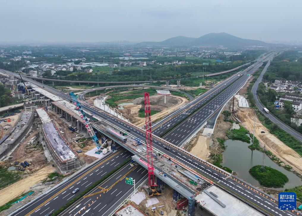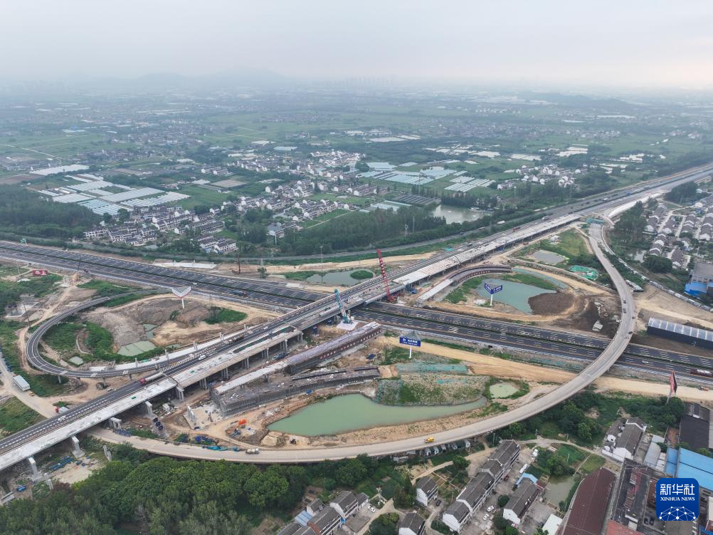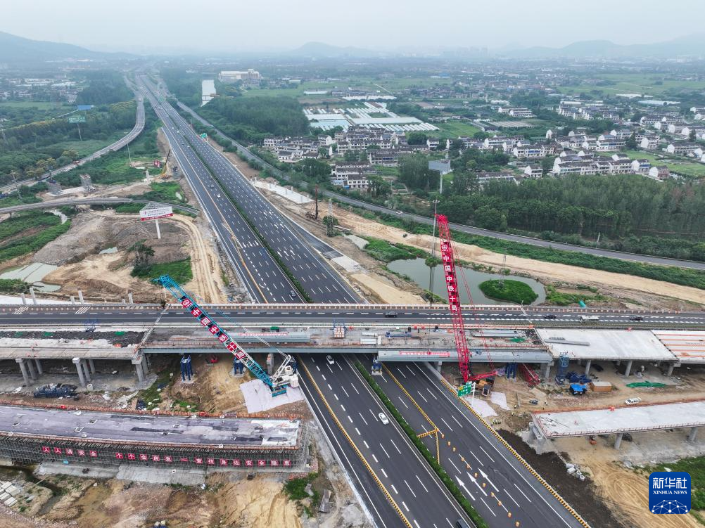 9月13日拍摄的沪武高速公路扩建工程江阴段上跨京沪高速公路钢箱梁架设施工现场(无人机照片)。
