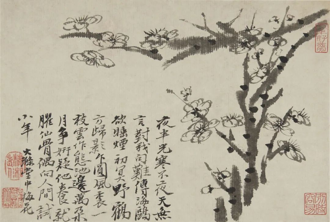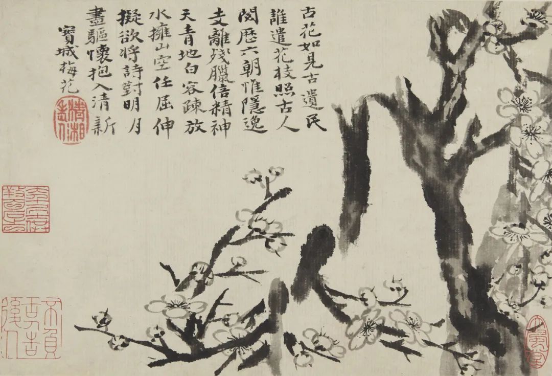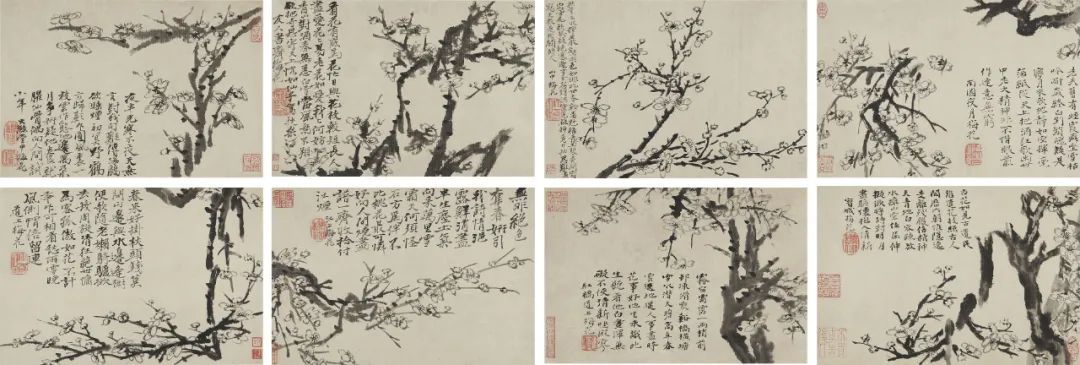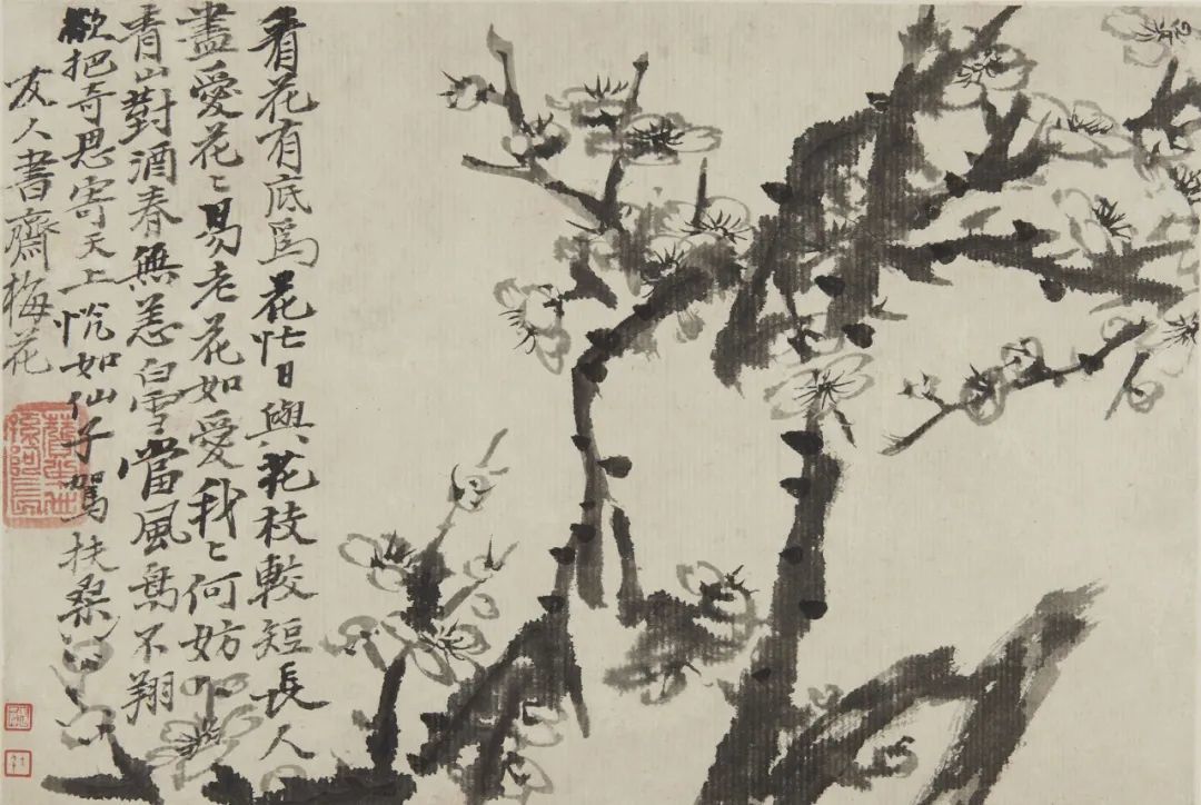 石涛此《梅花图册》,皆水墨逸笔,或疏影横斜,或凌空独放,或盘屈如龙蛇飞舞,或龙钟如老人入定,劲枝瘦朵,或点或勾,皆郁然有生气。每幅都作诗题咏,或行或草,诗书画相互生发,读之令人流连不止。