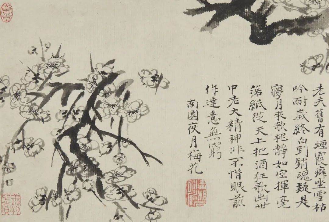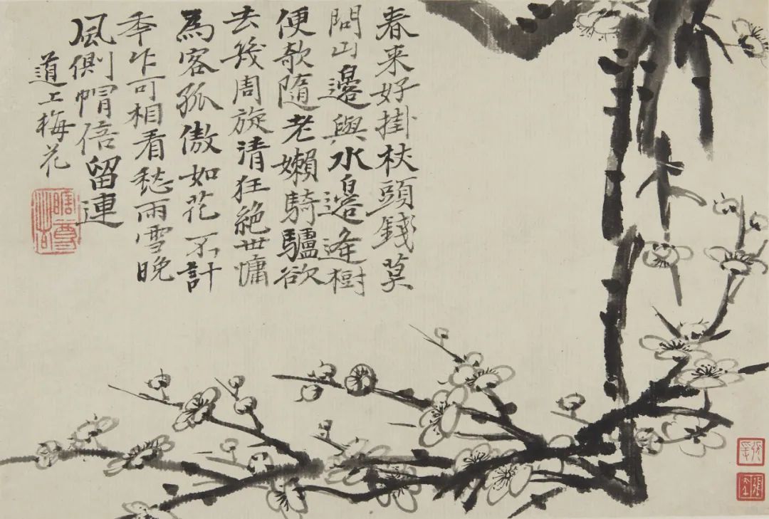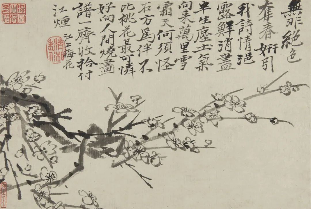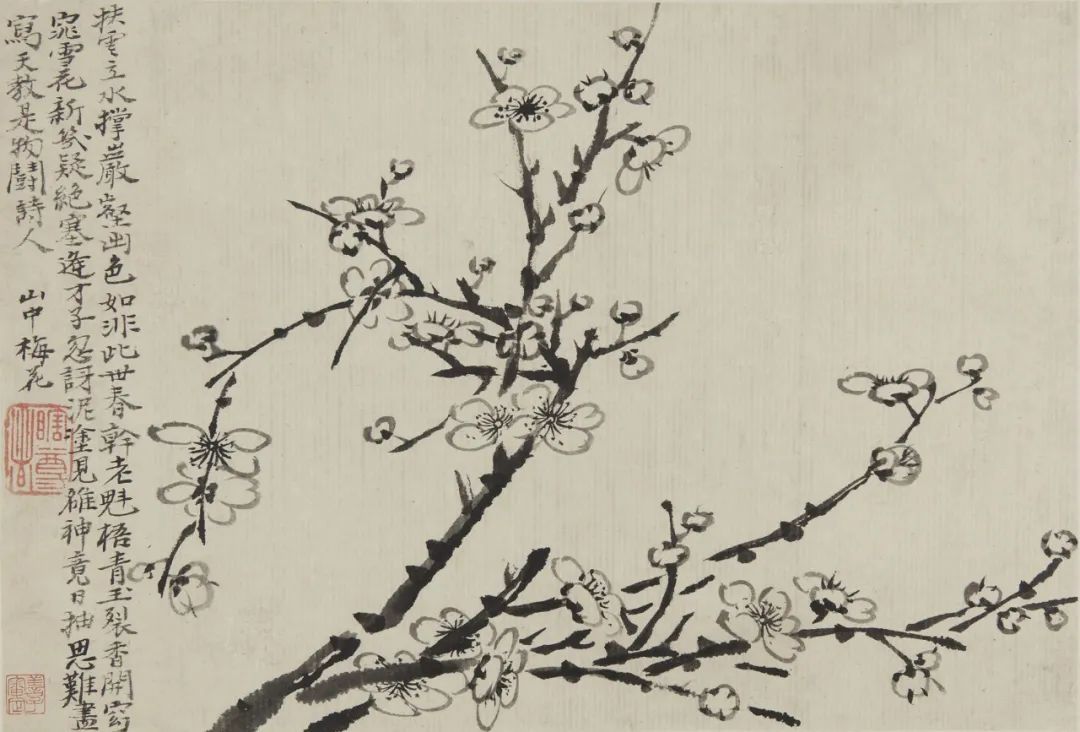 石涛和尚是个天才型艺术家,他山水、花鸟、人物、走兽、兰竹无一不能亦无一不精,又好画梅花,尝作咏梅诗百首。其画梅绝去依傍,大多写观察所得。