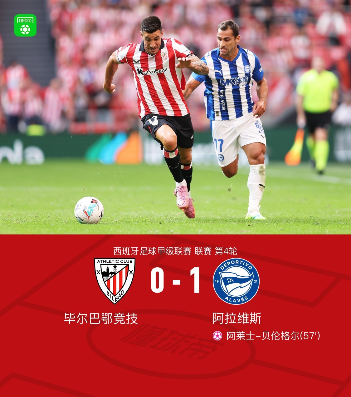 9月14日,西班牙足球甲级联赛第4轮,毕尔巴鄂竞技坐镇主场迎战阿拉维斯。比赛中,毕尔巴鄂竞技球员阿莱士-贝伦格尔不慎自摆乌龙。凭借这一关键进球,阿拉维斯以1-0的比分客场击败对手。