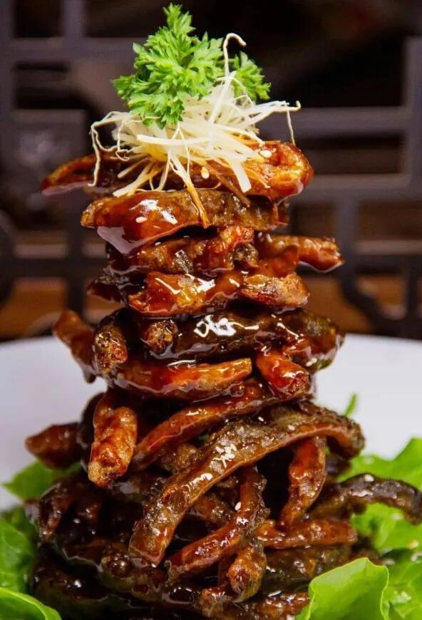梁溪脆鳝最早源于无锡船菜,是一道制作工艺复杂的功夫菜,也曾登上国宴菜单。鳝丝需经过“三炸三熘”,先将新鲜鳝鱼宰杀洗净,划成鳝丝,放入八成热油中炸至金黄捞出,待油温再次升高,复炸至酥脆,接着浸入由酱油、白砂糖、姜、葱等调制的秘制老卤中,反复浸润入味。成品乌黑油亮,形似笔杆,堆叠如小宝塔。咬下去,先是“咔嚓” 的极致酥脆,紧接着是鳝肉的柔韧,甜味率先袭来,随后咸鲜涌动,最后还有陈皮的清香回甘,层次丰富,令人叫绝。在二泉园老菜馆,便能品尝到这道地道美味。