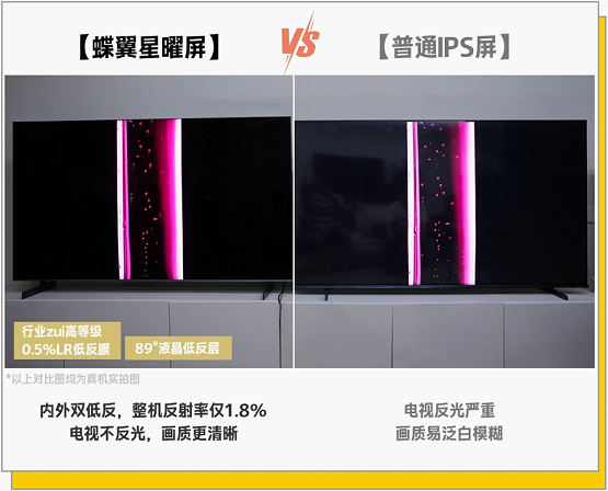 采用行业最高等级的0.5% LR低反膜与89度液晶内低反组成的双低反方案,成为TCL T7L Ultra在同级产品中的核心优势,整机低至1.8%超低反射率,能够确保电视无论白天黑夜,无惧外界环境光干扰,显著低于同级产品AGLR屏的2.6%反射率,相较磨砂屏方案画质表现也更加通透,画面纯净不泛白,观影清晰更沉浸。此外,蝶翼星曜屏还具备7000:1原生对比度,是普通IPS(1200:1)屏幕的五倍以上,暗场画面细节更丰富,色彩层次感也更好