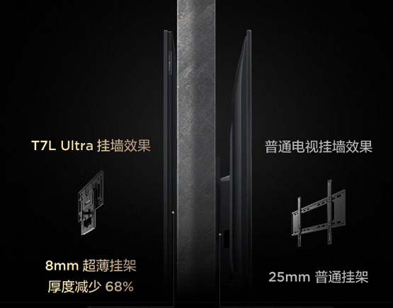 TCL T7L Ultra搭载了天花板级的音频硬件配置同时,也具备比同价位产品薄20%的一体化机身设计,搭配专用超薄磁吸挂架时,可实现更加严丝合缝的贴墙安装,为简约家居美学添彩。