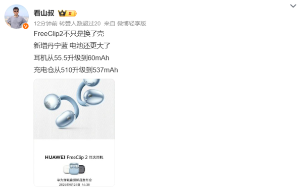 性能方面,华为FreeClip 2耳夹耳机有望在传输速率、音质解析力及佩戴体验实现多维升级。新耳机的声场表现将显著拓宽,并支持星闪(NearLink)技术,有望提升连接稳定性与音频质量。另外,耳机本体将配备60mAh电池,充电仓则为537mAh电池。