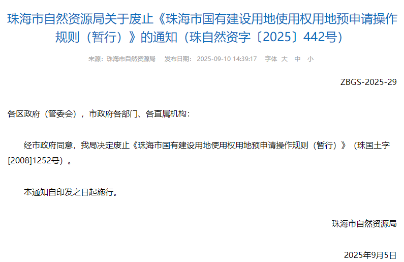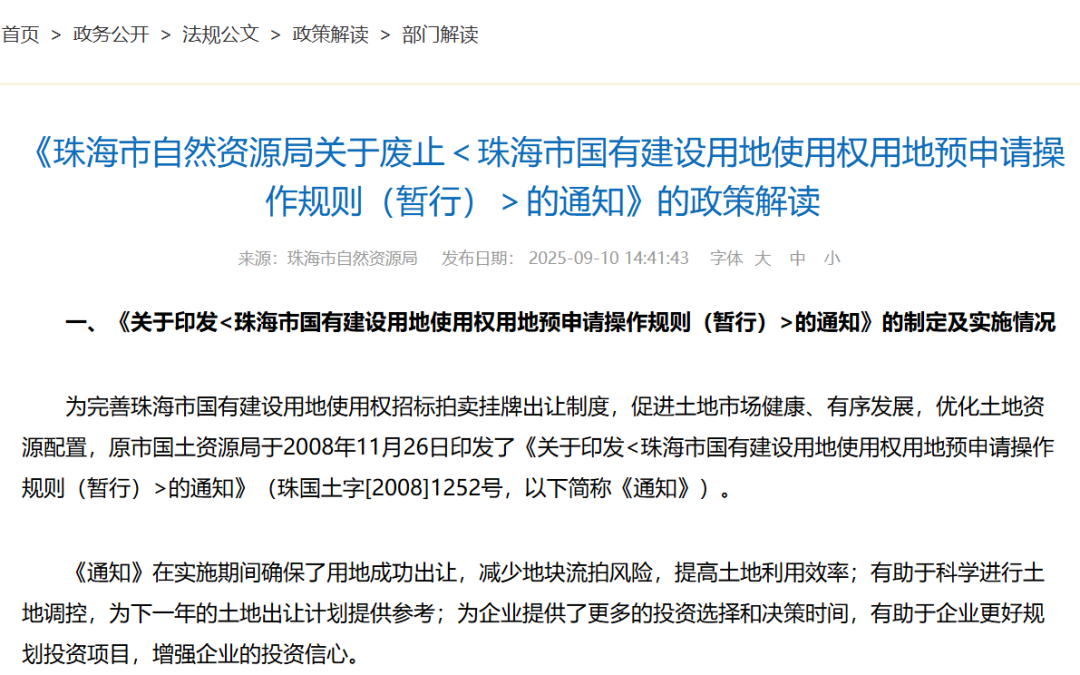 日前,珠海市自然资源局发布“关于废止《珠海市国有建设用地使用权用地预申请操作规则(暂行)》的通知(珠自然资字〔2025〕442号)”及「政策解读」。