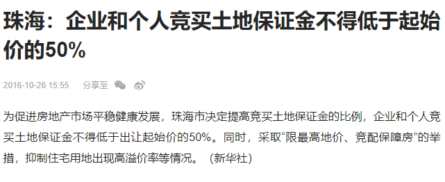 在2016年10月,珠海曾将经营性用地竞买保证金比例从30%上调至50%。