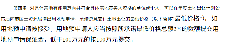 如用地预申请被接受,用地预申请人应当按照所承诺最低价格总额2%的数额提交用地预申请保证金,低于100万元的按100万元提交。