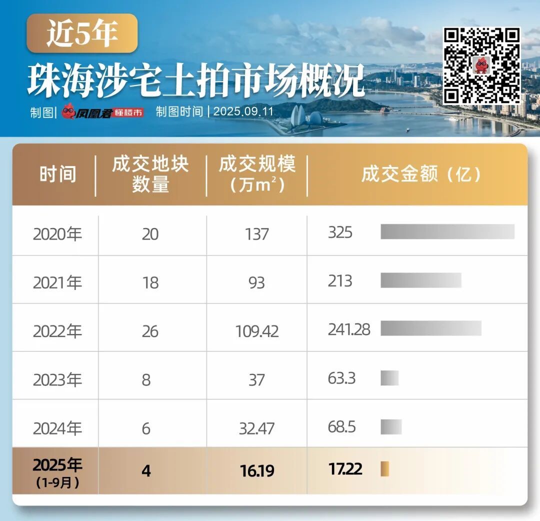 截止2025年9月10日,珠海更是仅共成交4宗涉宅用地,共揽金约17.22亿。
