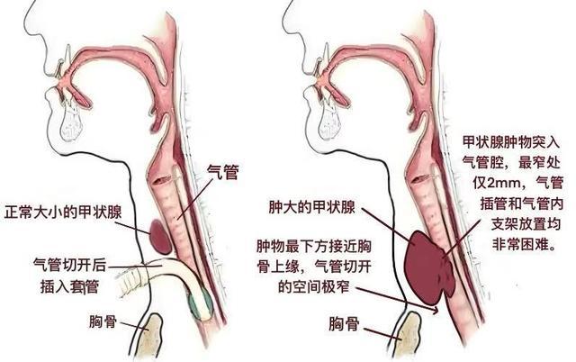 (▲左:常规气管切开示意图。右:本例患者气管切开难度大示意图。)