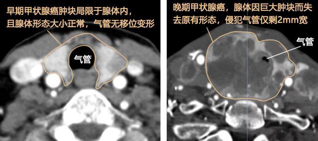 (▲甲状腺癌患者CT横截面图。左:早期甲状腺癌。右:本例患者的晚期甲状腺癌)
