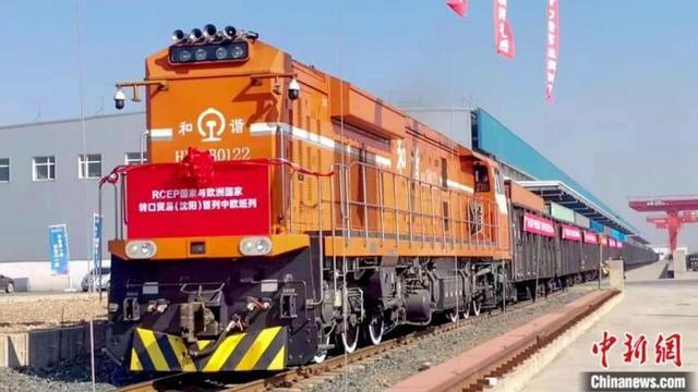 2023年3月18日,RCEP国家与欧洲国家转口贸易(沈阳)首发仪式在沈阳市沈北新区诚通贸易港举行。首列装载着RCEP国家商品的中欧班列以转口贸易的形式将商品运往欧洲。中新社记者 赵桂华 摄