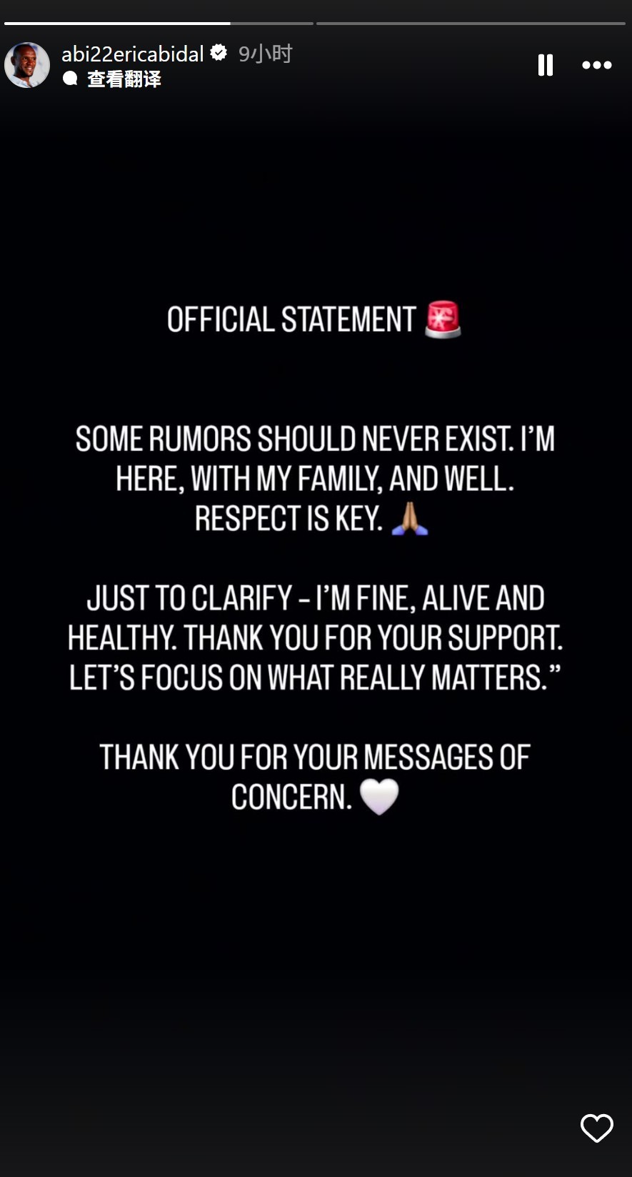 阿比达尔在社媒上发布声明,直接否认了这一消息:“有些谣言根本不该存在。我和家人在一起,一切都很好。请大家明白,我很好,我还活着,身体健康。感谢大家的支持和关心。让我们关注真正重要的事情。”