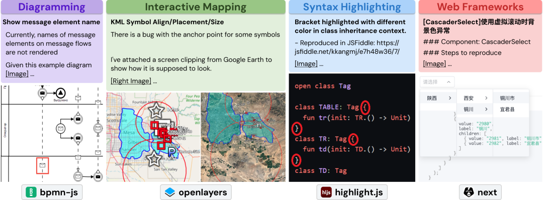这是目前最具挑战性的基准之一,涵盖了 517 个真实的多模态问题,广泛来源于开源 JavaScript 库(如 bpmn-js、carbon、openlayers 等)。