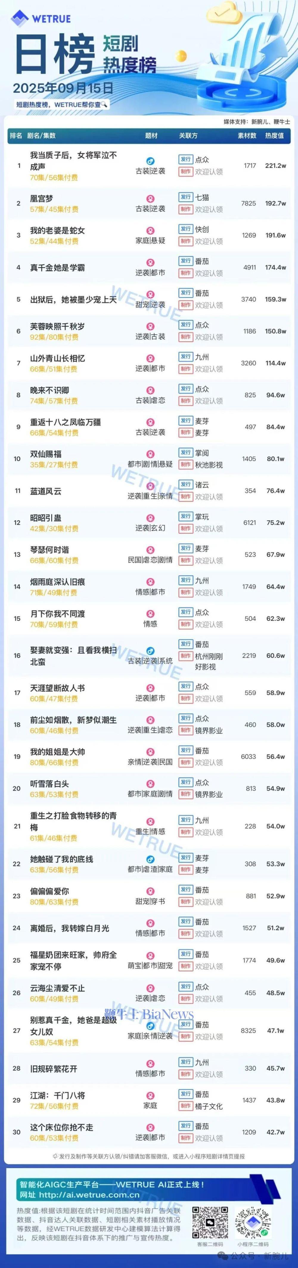 1、本日榜为WETRUE短剧数据公司提供,新腕儿和鞭牛士提供联合支持。