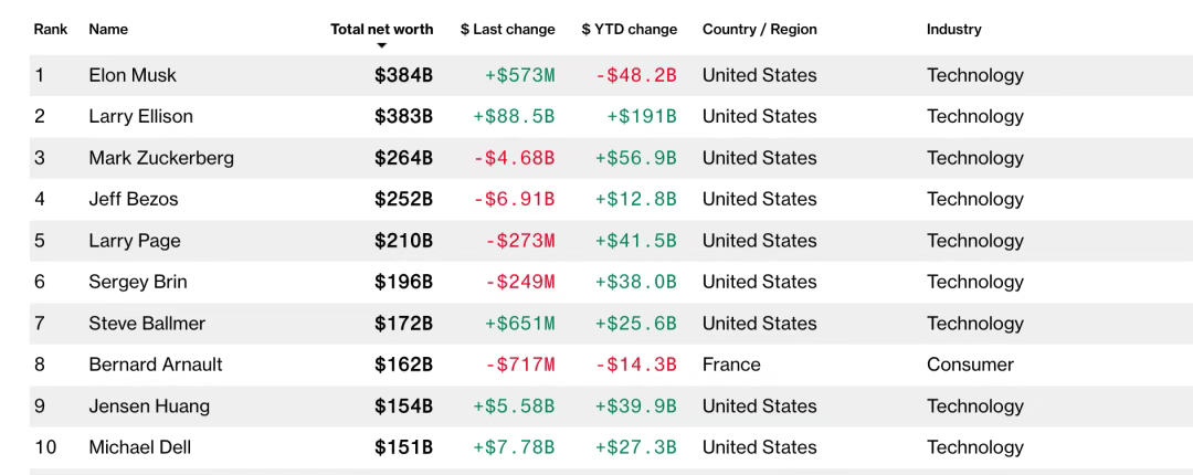 在埃里森和马斯克之后,紧随其后的还有Meta创始人扎克伯格、亚马逊创始人贝索斯,以及Google的拉里·佩奇和谢尔盖·布林。这些科技大佬的财富同样惊人,但榜单排名每天都可能变化。对外界来说,这不仅是一份财富榜单,更像是一场科技巨头们在市场和业务上暗中较量的“战争”。
