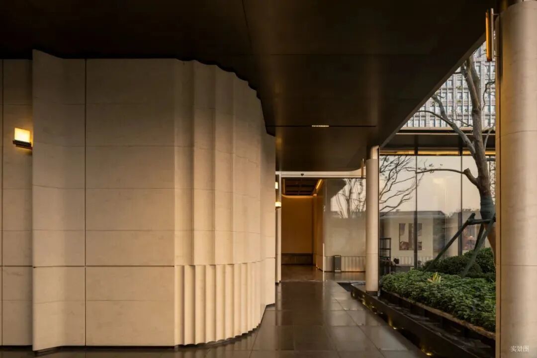 金陵序打破传统直线桎梏,以曲线为主旋律,再定义建筑的线条审美,广泛运用于社区外围、庭院、室内与各局部细处。设计出一种传承经典曲线元素又与过往截然不同的立面样式,弧形石材+铝板+玻璃幕墙,营造视觉上更高级的立体层次美感,传递南京独特气质同时,更创造南京第四代住宅外立面上的首例公建化实践。
