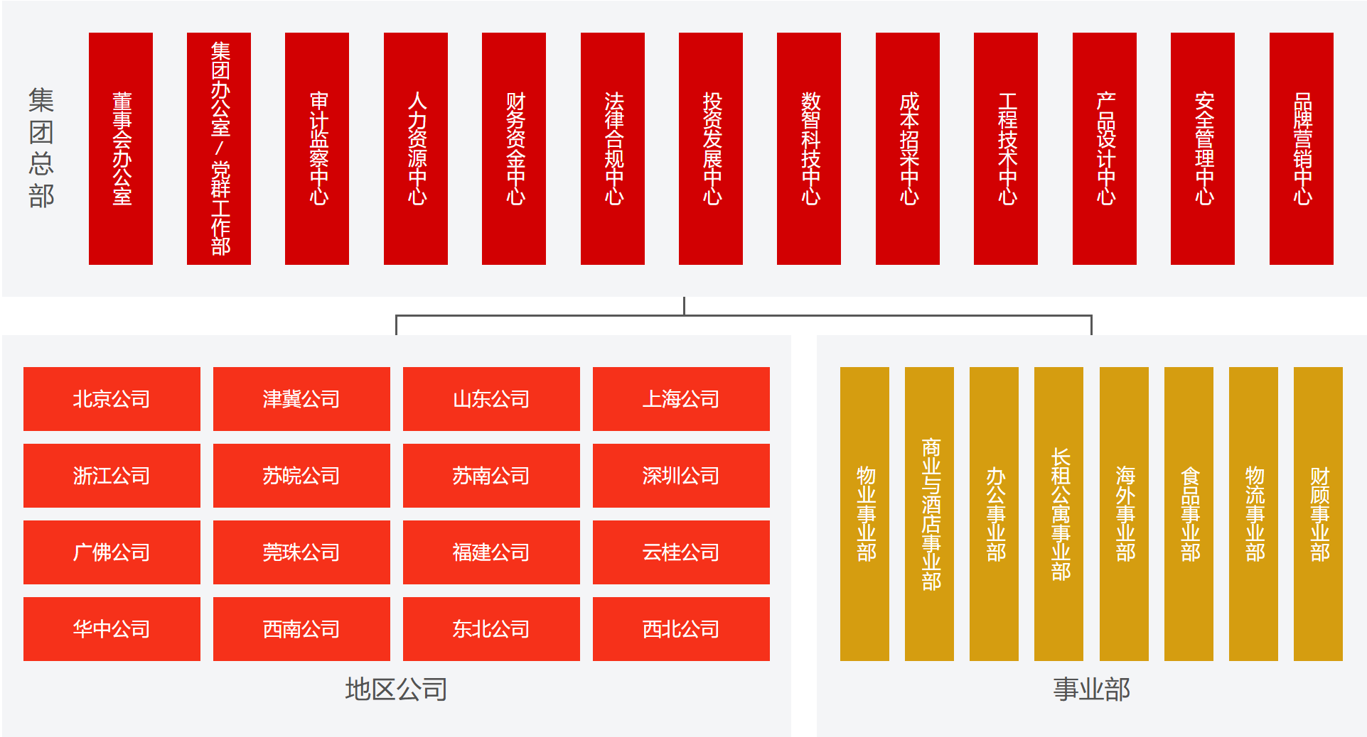 新的组织架构包括集团总部、地区公司和事业部。其中,集团总部包括董事会办公室、集团办公室/党群工作部和投资发展中心、审计监察中心等11个中心;地区公司为北京公司、津冀公司、上海公司等16个公司;事业部则包含了物业、商业与酒店、长租公寓、物流等八大多元化业务。