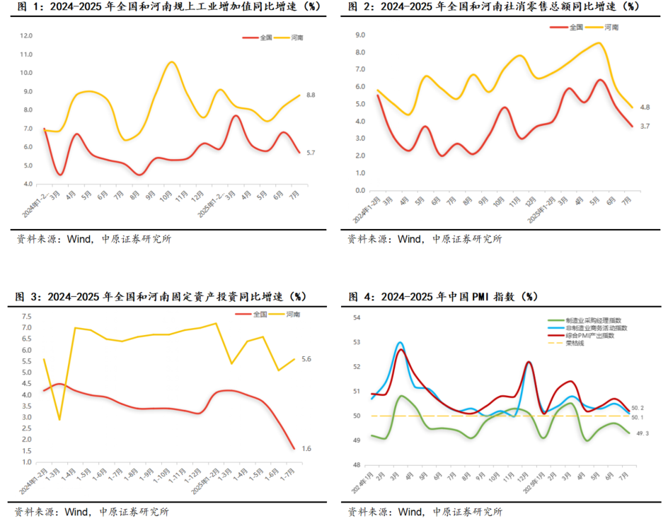 总体来看,2025年7月份,河南省工业生产加速增长,社会消费平稳发力,固定资产投资略有回升,主要经济指标增速持续高于全国平均水平,整体呈现稳中向好发展态势。但同时,从内部结构来看,社会消费、工业投资等指标出现边际降速现象,表明内生动能仍有不足,未来还需政策呵护夯实经济向好基础。