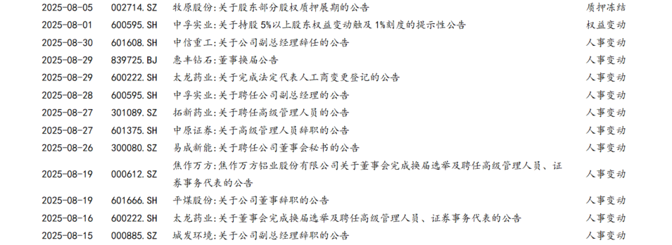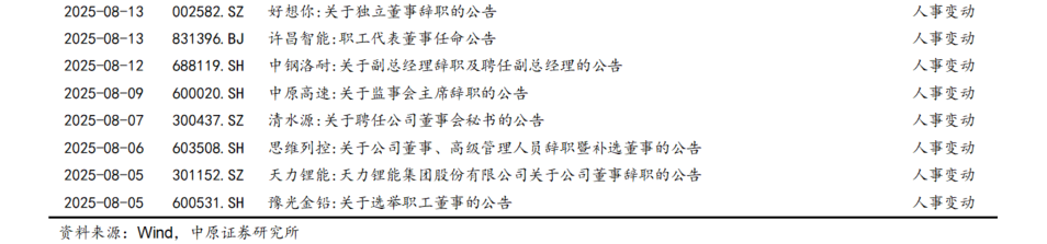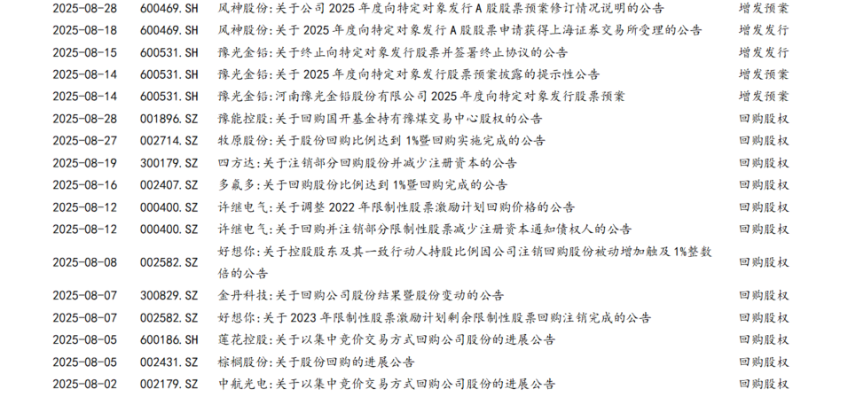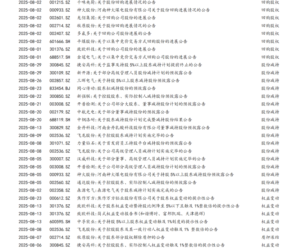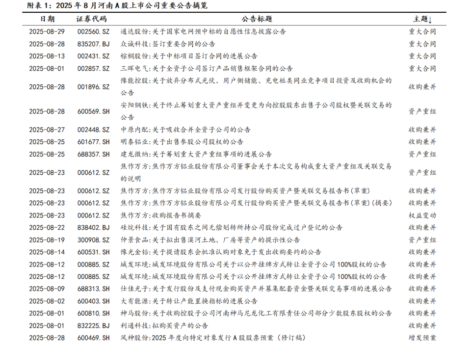 2025年8月份,河南上公司公告可重点关注并购重组和股份减持等事项。例如:焦作万方通过增发收购资产、安阳钢铁终止筹划重大资产重组等公告,三晖电气、力量钻石、神火股份、通达股份、新开源、开普检测等公司股东或高管减持预披露公告,以及焦作万方完成董事会换届、惠丰钻石董事换届等公告。详见“附表1:2025年8月份河南A股上市公司重点公告一览表”。